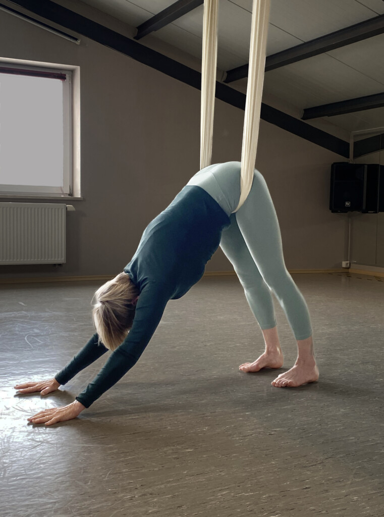 Inversionen fördern Durchblutung und Länge im Rücken. Was auf der Matte anspruchsvoller ist, fühlt sich im Tuch selbstverständlich und sicher an.