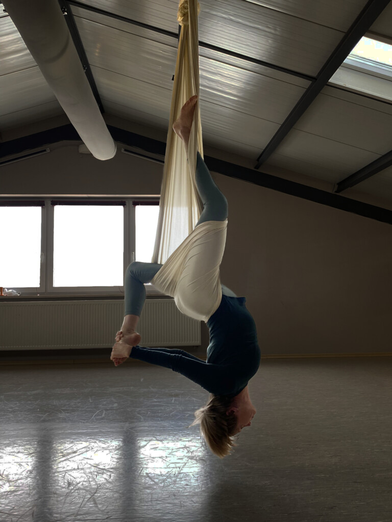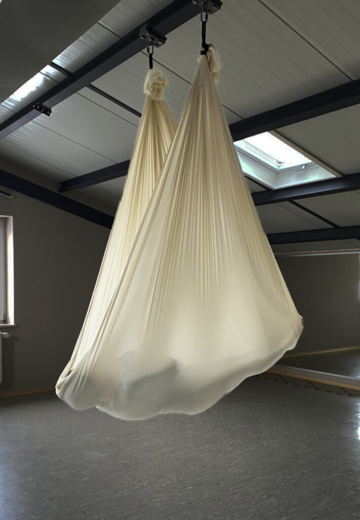 Aerial ist eine Form von Yoga im Tuch. Ein weiches, von der Decke hängendes Tuch trägt dich, entlastet Gelenke und Wirbelsäule und unterstützt klassische Asanas. So können neue Bewegungsarten und -räume zu entdeckt werden, von sanfter Mobilisation bis hin zu spielerischen Umkehrhaltungen wie Kopf- und Handstand. Regelmäßiges Praktizieren steigert Kraft und Balance. Im Tuch entsteht ein Gefühl von Leichtigkeit und das Getragen-sein führt zu tiefer Entspannung.