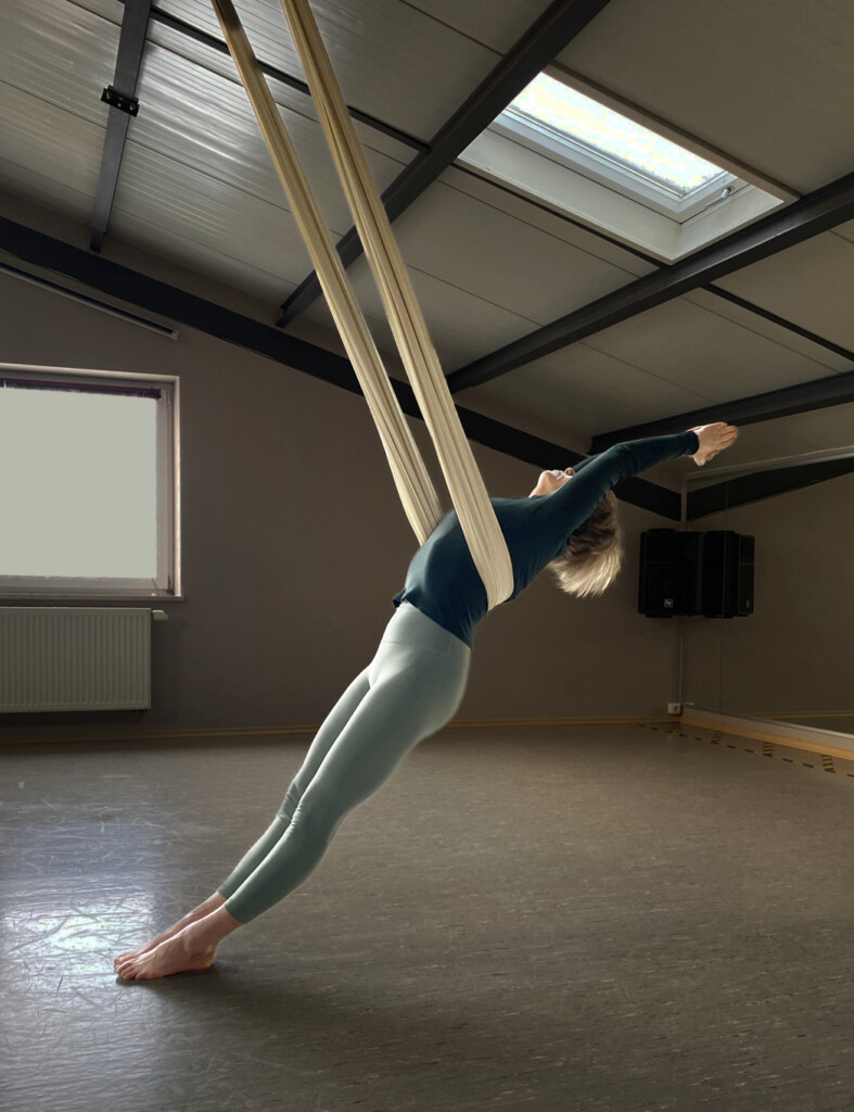 Aerial ist nicht nur etwas für Sportliche oder Yogis, sondern auch für Einsteiger:innen geeignet. Du musst keine besondere Fitness mitbringen, aber du solltest dich schmerzfrei im Alltag bewegen können. Für jedes Asana gibt es eine leichtere Variante. Jede Haltung wird Schritt für Schritt angesagt, sodass du dir keine Sorgen machen musst, nicht mitzukommen.